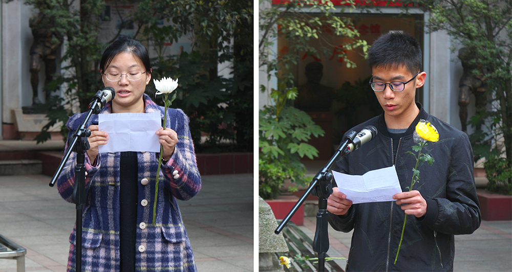活动现场,全体师生手持鲜花与花篮列队来到纪念碑前。在党支部副书记赵欢主持下,教师代表冀晶晶和研究生代表文祥为革命烈士纪念碑献上花篮,全体人员集体向烈士三鞠躬并默哀1分钟。随后,教师代表张琴和本科生代表周浩源分别以作“四有”好老师、坚定理想信念放飞青春梦想为主题做了讲话。接着,教师黄永安的带领下,全体党员一起重温了入党誓词。最后,大家怀着对革命先烈的哀思和崇敬献上鲜花。