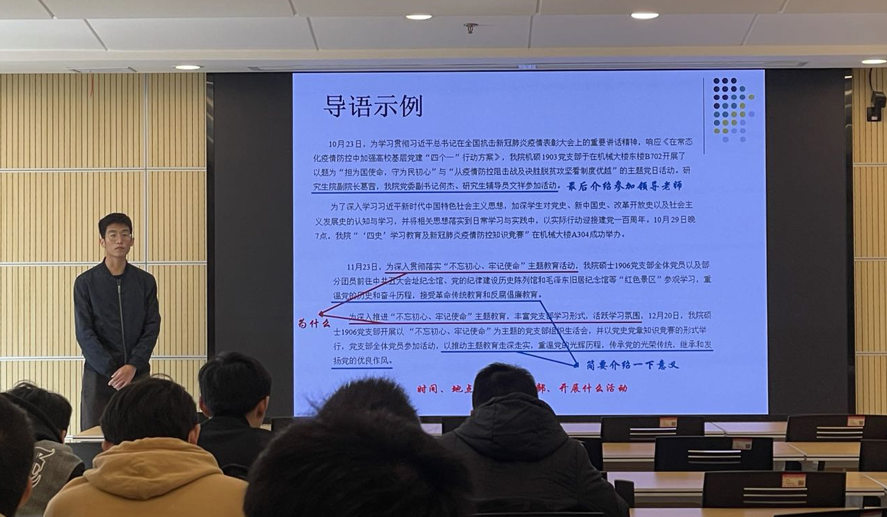 11月8日中午,第一期培训内容为“党建活动开展及新闻稿写作”,邀请了机硕2003班党支书周浩源和机硕2004班党支书滕钺分享经验,30余名党支部支委成员参加活动。