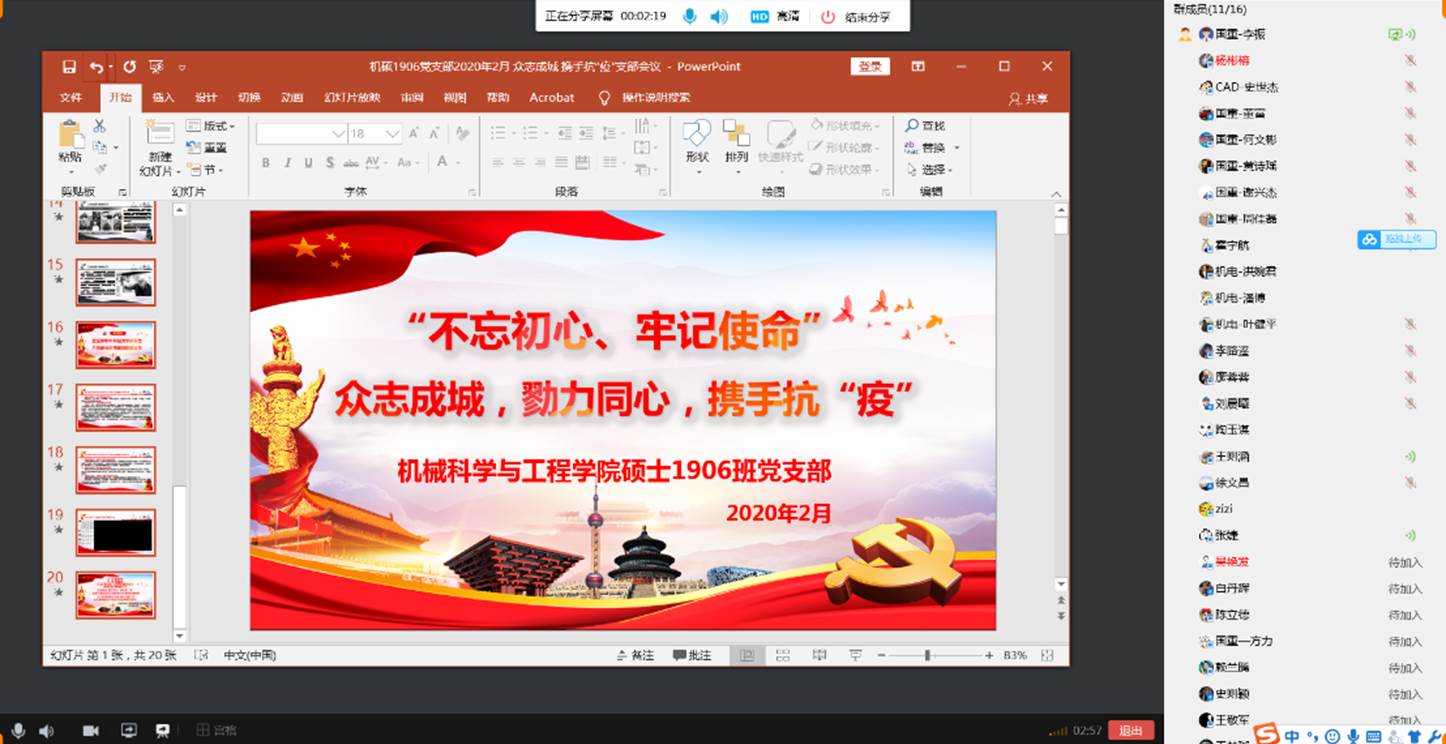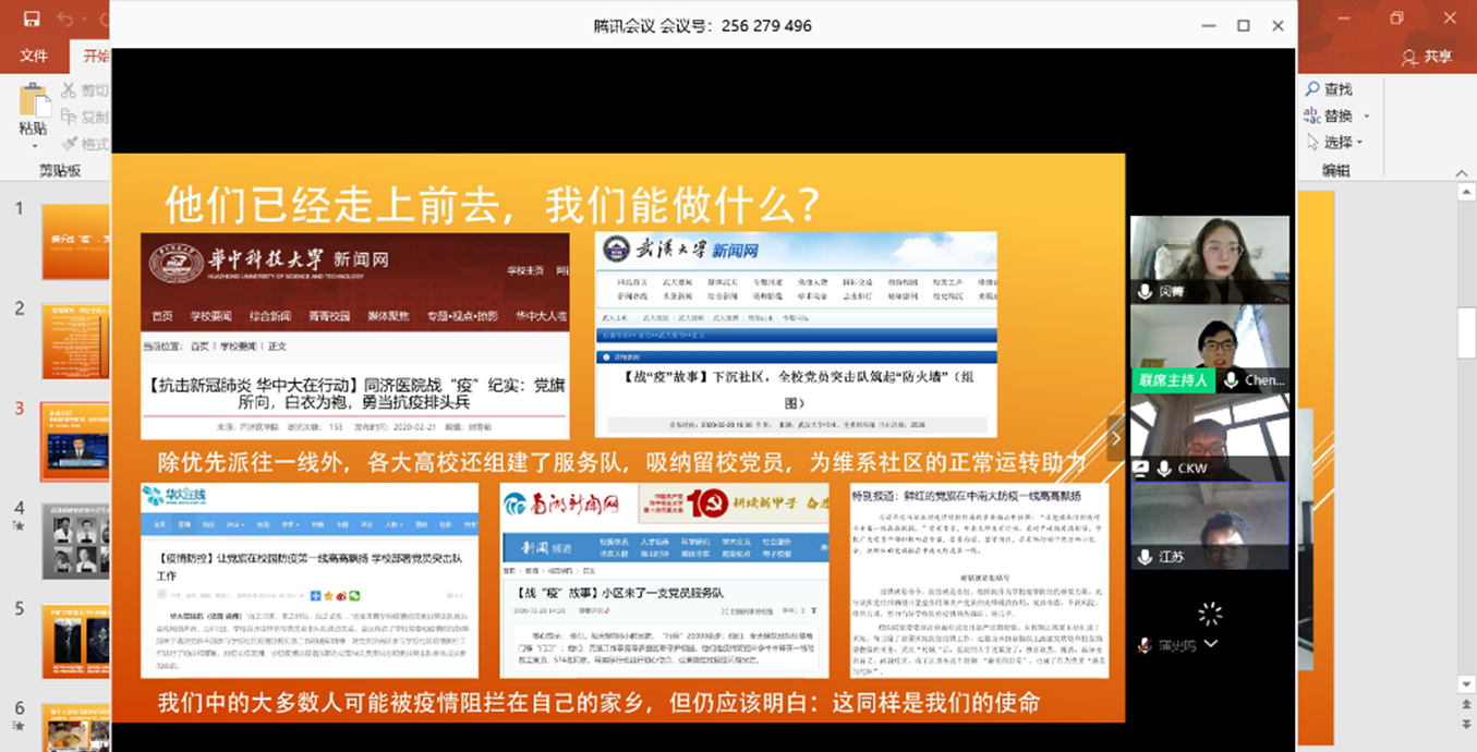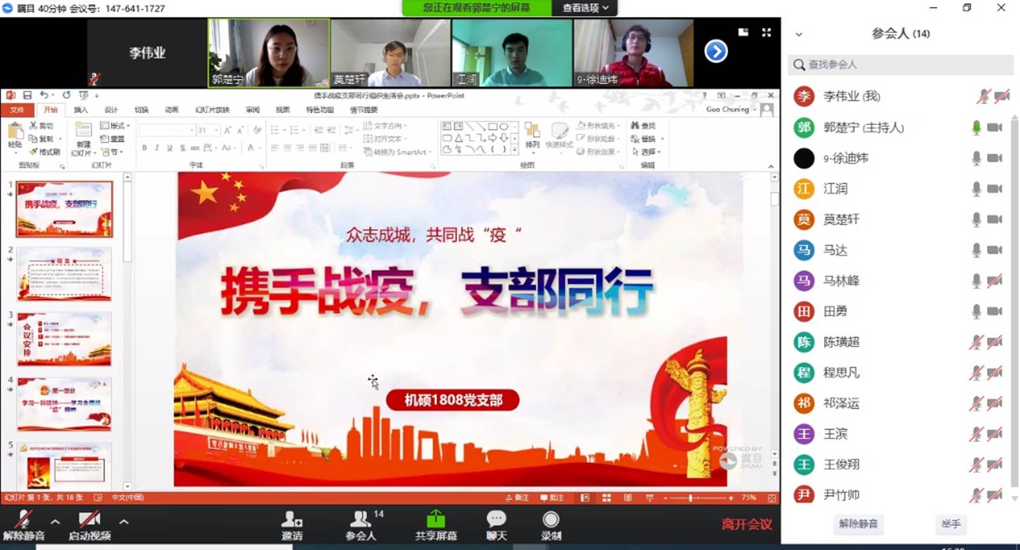疫情当下,机械学院各研究生党支部通过网络组织每位党员学习全国战“疫”精神,要求有所思有所行,并通过召开线上党组织生活会进行集中讨论、思想碰撞,以更深入学习贯彻有关精神和指示。