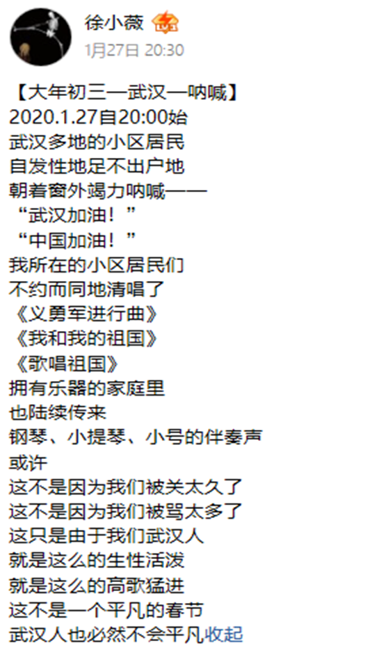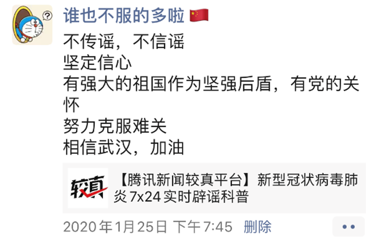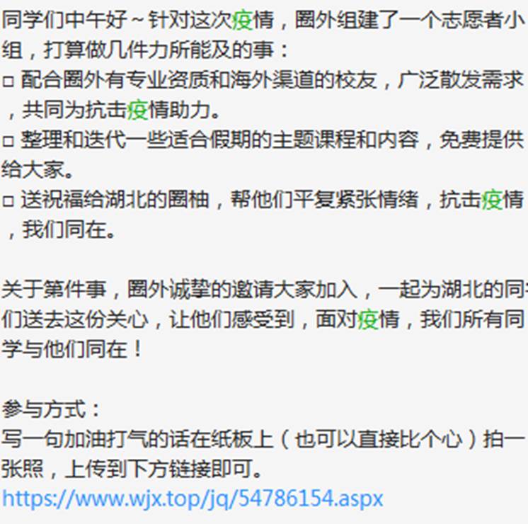 硕士1809党支部柯新月:在湖北人民与新型冠状病毒抗争期间,我参加了一个线上志愿活动:每个人发一条语音或者拍一张与抗“疫”有关的照片。我希望通过这种方式传递温暖和关怀,作为一名中国共产党员,在国家危难之时,挺身而出,责无旁贷。作为一名学生,能力有限,所以我加入志愿者大军,希望发挥集体的力量,传播正能量。