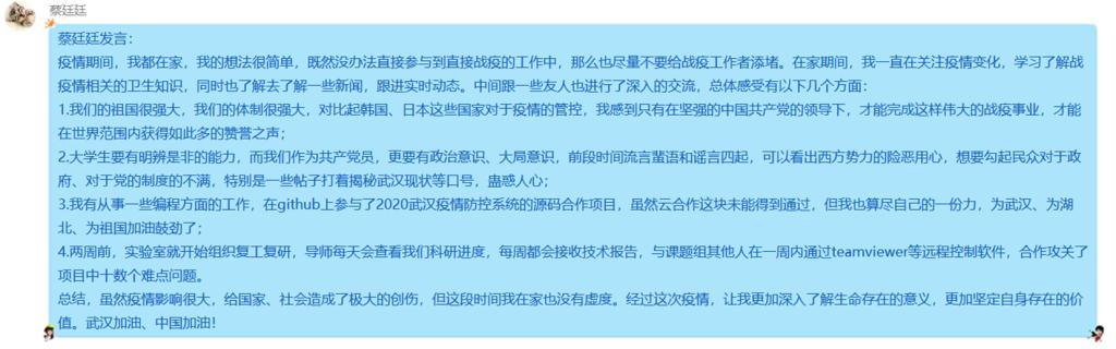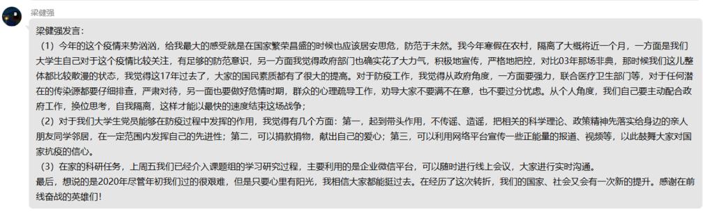 硕士1803党支部包璐胜:在疫情爆发的第一时间,党中央、国务院迅速做出反应,习近平总书记亲自挂帅指挥,提出“疫情防控要坚持全国一盘棋”,全国上下各级党委、政府坚决执行中央命令,驰援湖北并不惜一切代价控制住本地疫情扩散。这场不亚于小型战争的疫情阻击战,让我们看到了我们党强大的组织能力、动员能力,以及应对突发状况时迅速调整应对的能力,也看到了全体人民对以习近平总书记为核心的党中央的信任与拥护。目前,得益于全国人民齐心协力、听党指挥,各地疫情控制都取得了较好的成果,我相信我们一定可以赢得疫情阻击战的胜利!