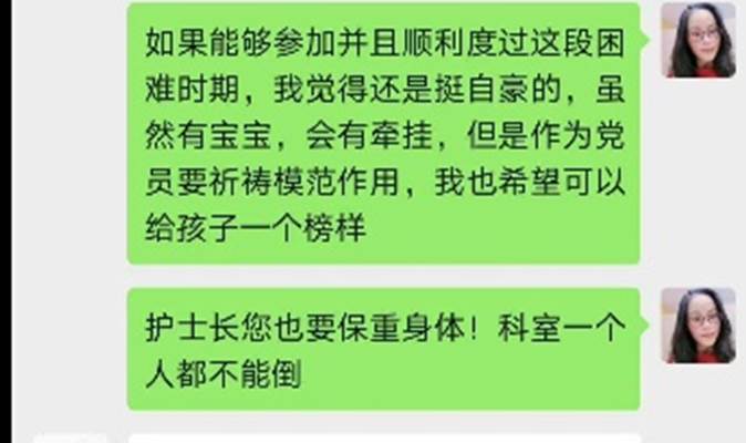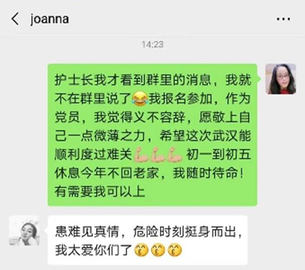 硕士1809党支部江鑫:下面是新冠肺炎发生时我表姐科室招募志愿者的微信聊天记录,我姐说身为一名中国共产党员,她认为冲在一线是义不容辞的,愿意敬上自己一点微薄之力,并且春节期间随时待命。这不仅是她身为一名护士,秉承医生救死扶伤的觉悟,更是身为一名中国共产党员在国家、人民需要她的时候冲锋陷阵的决心。