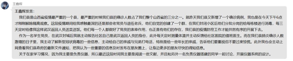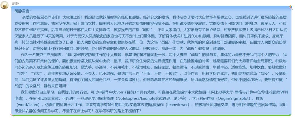 CAD_流体博士党支部乔平:在新冠肺炎发生之后,习总书记关于疫情防控的重要讲话给我们指明了防控要点,也给了全国人民强大信心。疫情就是命令,防控就是责任。面对疫情,华中大医学人第一时间冲上了疫情防治的一线,全校也给了最大限度的支持,华中大是全国投入最多床位和医护人员的高校,10家附属医院投入战疫。华中大校友联合起来,积极捐款支援武汉,也为母校和武汉带来了更大的信心。在这场疫情面前,华中大学子响应教育部“守护者”和“识途者”的号召,在家积极做好防护,认真学习,克服困难投入科研,同时也力所能及地为疫情防控做贡献。