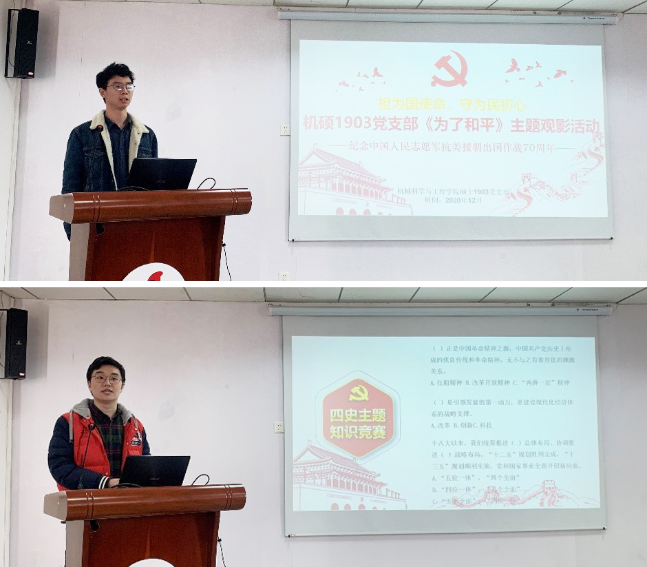 12月25日,英国365公司官网机硕1903党支部为进一步丰富“四史”学习教育的内容和形式,同时也为深入贯彻落实习近平总书记在纪念中国人民志愿军抗美援朝出国作战70周年大会上的重要讲话精神,加强新时代爱国主义教育,开展《为了和平》了观影会暨“四史”学习教育座谈会。