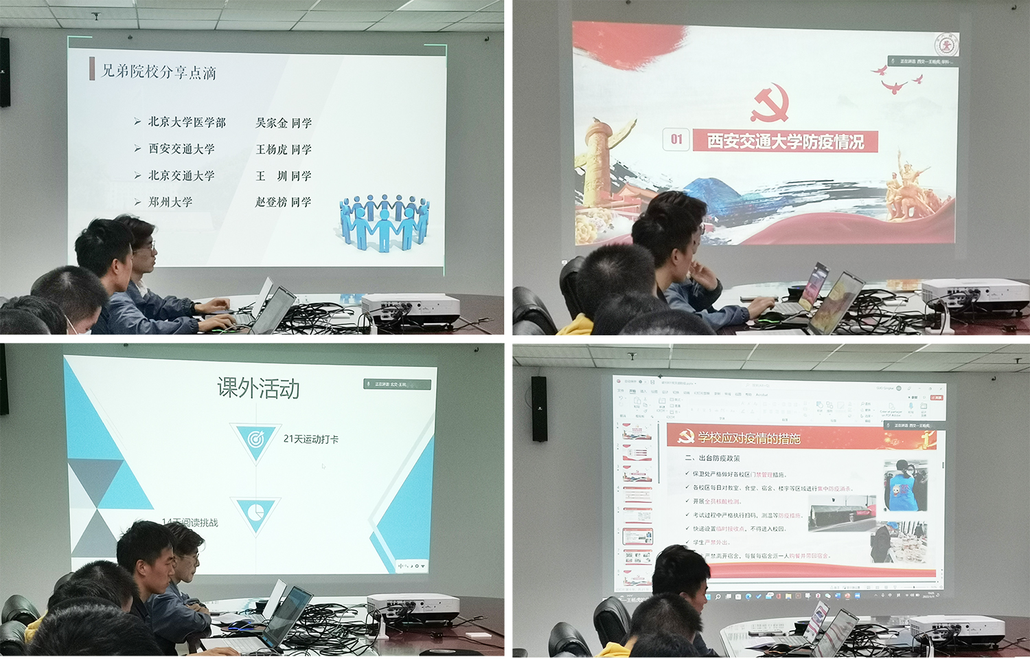 北京交通大学医学部的吴家金同志在分享中提到,身边很多医科生在疫情期间奔走在抗疫一线,这是对他们医学素养和医学能力的综合考验。西安交通大学的王杨虎同志分享了西交的抗疫历程、学校的应对措施以及学院的应对措施,例如:构建学院疫情防控网络化管理、组织学院党建工作办公室成员抗击疫情等。北京交通大学的王圳同志则是分享了疫情期间的相关校园活动,有21天运动打卡活动、14天阅读挑战活动、线上“庆祝中国共青团成立100周年”宣讲会以及在冬奥期间学校百余名师生加入冬奥志愿者团队,为北京冬奥贡献了北交力量。郑州大学赵登榜同志为我们介绍了面对近期郑州疫情爆发的情况,学校快速做出相关组织和安排,积极保障学生生活。纵有疫情相隔,但我们对抗击疫情的决心和信心都是一样的。