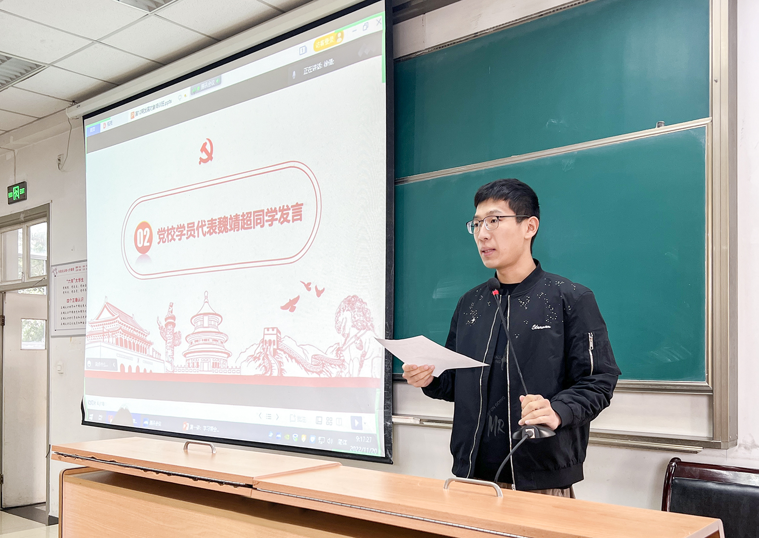 党校学员代表魏靖超发言,他倡议大家要以一百年前那群高举马克思主义思想火炬,在风雨如晦的中国苦苦探寻民族复兴前途的新青年为榜样,让青春在全面建设社会主义现代化国家、全面推进中华民族伟大复兴的火热实践中绽放绚丽之花。