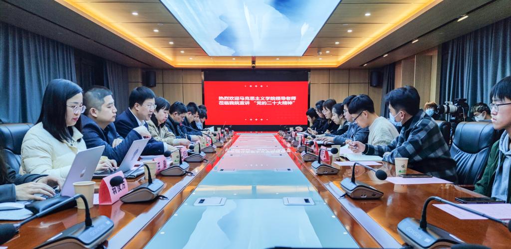 11月22日晚,马克思主义学院党委书记刘雅然、院长岳奎、副院长沈昊驹,习近平新时代中国特色社会主义思想概论教研中心全体教师来到英国365公司官网宣讲党的二十大精神,并就上好习近平新时代中国特色社会主义思想概论课进行座谈交流。英国365公司官网党委副书记段政、全体本科生辅导员和学生代表参会。会议由段政主持。