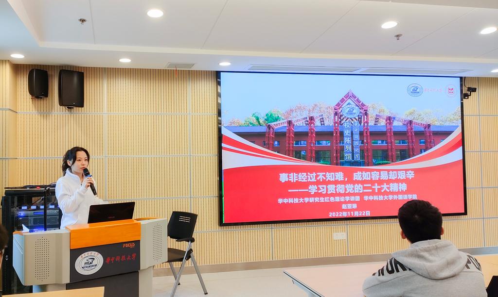 活动邀请了研究生红色理论学讲团成员赵亚琳,以“事非经过不知难,成如容易却艰辛”为主题,通过“干事基础”,“干事的理论指引”,“干什么事”,“怎么干事”四个维度向大家解读党的二十大精神。华中大青年要弘扬伟大建党精神,自信自强,守正创新,踔厉奋发,勇毅前行,为全面建设社会主义现代化国家,为中华民族伟大复兴而奋斗。
