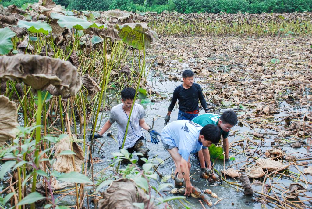 莲藕采收一直是农业生产活动中劳动强度最高的人工作业之一,为了解、体验其艰辛,师生们顾不上午休,午餐后乘车前往汉川汈东的一处莲藕种植片区,观摩人工莲藕采收。也许是上午的采摘让大家心有所动,又或是深刻认识到“纸上得来终觉浅,绝知此事要躬行”,同学们主动要求亲自感受挖藕的过程。经过充分协商与安全保障,在当地农业专家的指导与看护下,3名同学亲自下塘挖藕。从手足无措到顺根摸藕,从小心翼翼到全心投入,从陌生到熟练,当一条条新藕出于淤泥,同学们的感悟与喜悦难以言表。