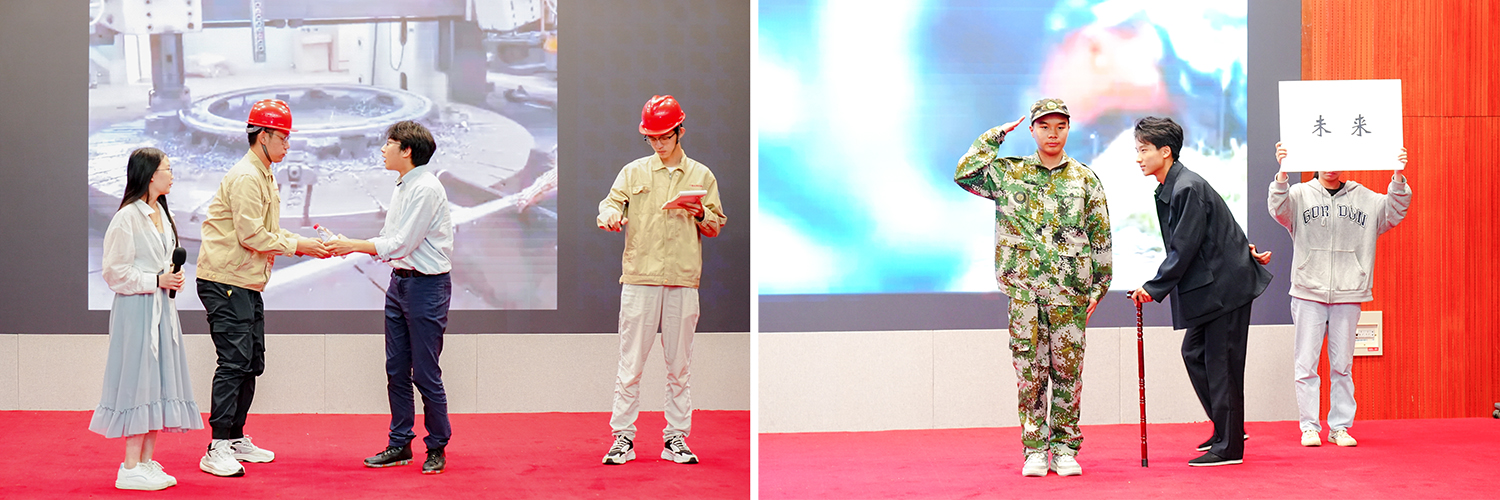由工商2204、产设2201、机械2206班团支部组成的联合团支部以舞台剧的形式,展现了他们一步步走近英雄、致敬英雄、争做英雄的故事。从包钢工业园区到街头巷尾,从退伍老兵到军校学子,他们用心贴近英雄,于互动中共鸣情怀。