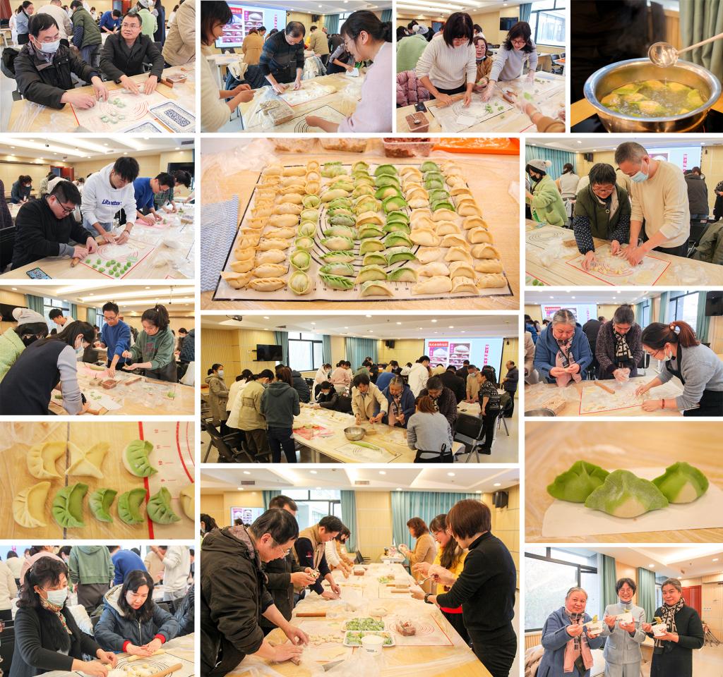 下午4点,报名参加活动的50多位教职工齐聚机械大楼东楼304教室。在指导老师的带领下,大家围在三张大长桌边,分工协作,拌馅、和面、分剂、擀面皮、包饺子、煮饺子,相互交流经验和技巧,欢声笑语不断,现场热闹非凡。指导老师还特意准备了用南瓜汁和菠菜汁和好的面团,大家运用不同的手法与创意创意,包出了各式各样的彩色饺子。随着饺子下锅,整屋弥漫着饺子的诱人香气,一个个由橙黄与碧绿组成的鲜艳的饺子,更加勾起了大家的食欲,沾着香醋、香油,一口咬下去,满满的全是家的味道。