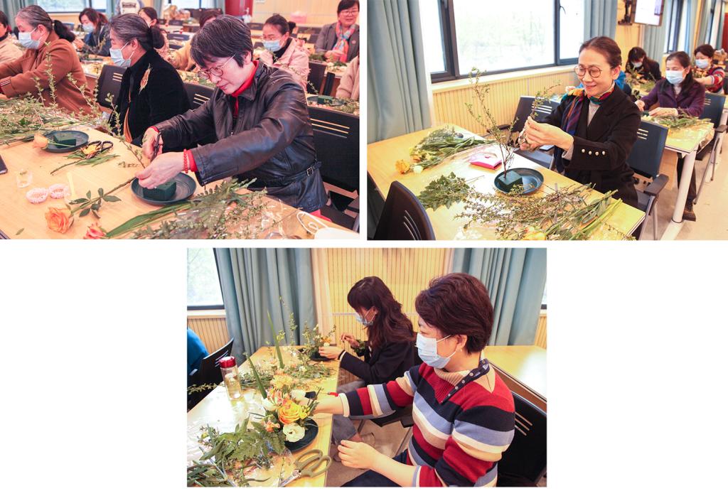 女教职工们相互交流探讨,气氛热烈,在花艺师的指导下开始修葺枝叶、搭配色彩。普通的花叶、枝条,经过大家精巧的修饰与创作之后,变成了层次分明、错落有致、令人赏心悦目的艺术品。