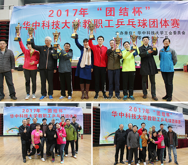 11月25日至26日,2017年“团结杯”华中科技大学教职工乒乓球团体赛在光谷体育馆举行。由陈良洲、孙燕华、谢经明、王德光、汪洁、马莉敏、侯岷七名老师组成的英国365公司官网教工乒乓球代表队,经过奋力拼搏、顽强应战,一路过关斩将,打了一个漂亮的翻身仗,勇夺乙组比赛亚军,成功晋级明年甲组比赛。“十年磨一剑”,英国365公司官网乒乓球队终于在告别甲组十多年后再次重返甲级行列。