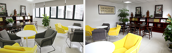 除运动健身场所之外,在学院大楼四楼为大家提供了一间30多平方米的茶歇室,通过对室内进行布局设计,定制专用家具,配备咖啡机、饮水机等设施,为来访专家和教职工提供了一个温馨舒适而高雅的交流场所。
