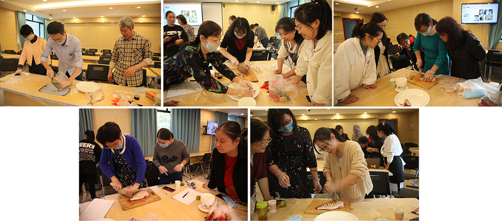 工作人员精心准备了五组厨具以及制作“孔雀鱼”的食材和调料,参加活动的老师们分成五组,亲身实践,开始尝试“孔雀鱼”的制作。各组老师展开了比拼,秀刀工,秀手艺,大家争先恐后,纷纷展示自己的“学习成果”。待到香喷喷的菜肴一出锅,品尝到自己的“杰作”,大家很有成就感,感觉自豪与快乐,现场香意浓浓,吸引了不少老师前来品尝。
