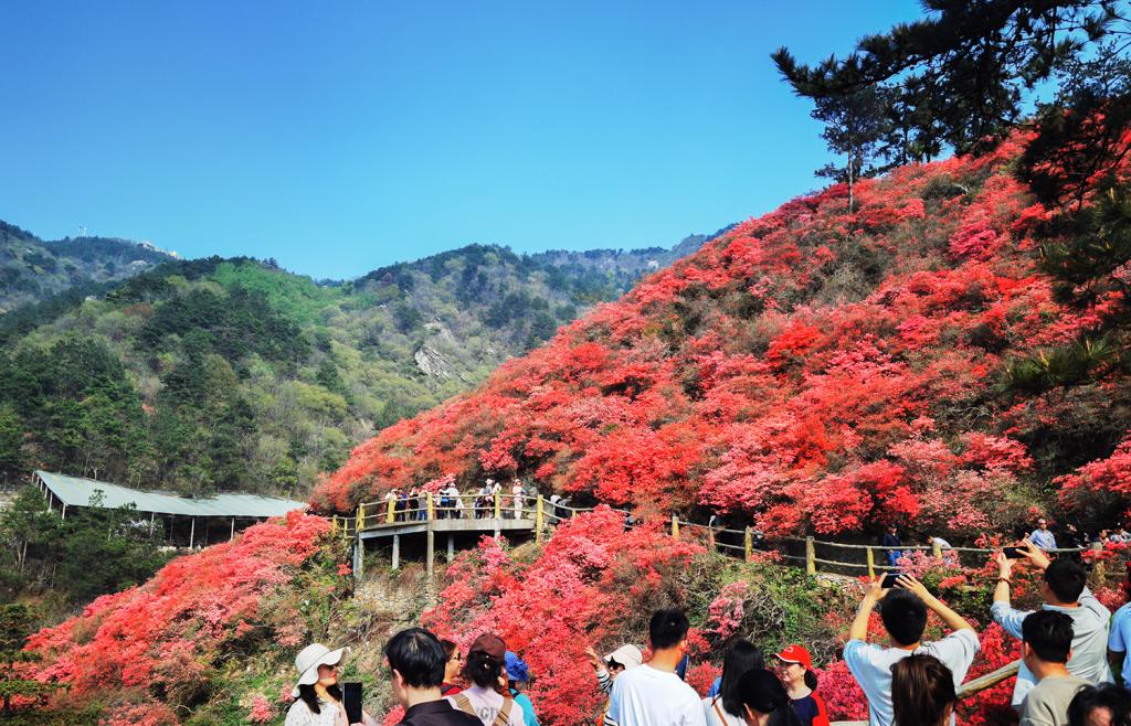 当下云雾山10000亩野生杜鹃盛开正艳,山体连绵起伏,红白相间的杜鹃花,漫山遍野竞相开放,绚烂的花海热烈动人,吸引了大量的游客涌入。深红、淡红、玫瑰、白色等不同色彩,满山鲜艳,彩霞绕林。