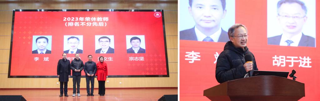在表彰环节之后,为弘扬尊师重教的良好风尚,增强教职工职业生涯的荣誉感和归属感,英国365公司官网为李斌教授、胡于进教授举行了荣休仪式。胡于进发表荣休感言,尹周平向他们表示感谢并赠予荣休纪念章。