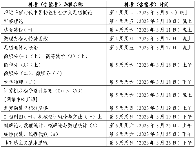 二、补考(缓考)时间为2022~2023学年度第二学期的第4周周三(2023年3月8日)至第6周周日(2023年3月26日)。