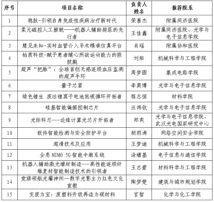 根据《第九届中国国际“互联网+”大学生创新创业大赛第一轮参赛项目征集的通知》,经专家组网络评审、集中评审,评选出“稳肽-引领自身免疫性疾病治疗新时代”等15个项目(详见下表)直接晋级校赛决赛小组赛。经公示无异议,现将晋级校赛决赛项目名单予以公布。
