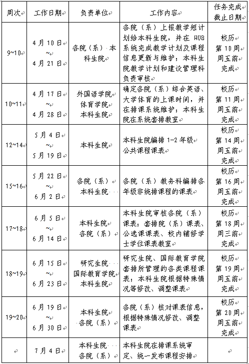 1.各院(系)主管教学工作的负责人是院(系)排课工作的第一责任人,要做好所属院(系)课表编排各个环节的督导与质量监控工作,并切实审核教学短计划、平衡表、课表及HUB系统中各类课表信息录入等情况。