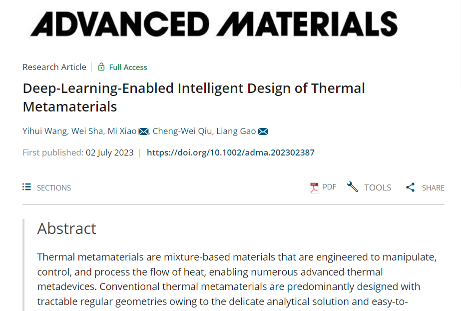 7月3日,国际权威期刊《Advanced Materials》(影响因子:29.4)在线刊发了英国365公司官网高亮教授团队关于热学超材料拓扑优化设计的最新研究成果“Deep-Learning-Enabled Intelligent Design of Thermal Metamaterials(深度学习赋能的热学超材料智能设计)”。英国365公司官网博士生汪逸晖、博士后沙伟为论文共同第一作者,高亮教授、肖蜜教授为论文共同通讯作者,新加坡国立大学仇成伟教授为论文合作者,华中科技大学智能制造装备与技术全国重点实验室为论文第一完成单位。