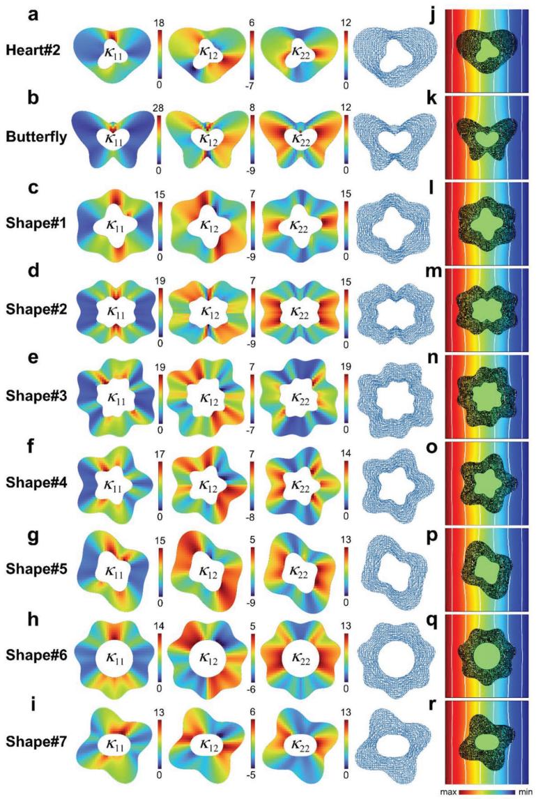 图3. 多种自由形状的热隐身超材料设计及数值仿真结果
