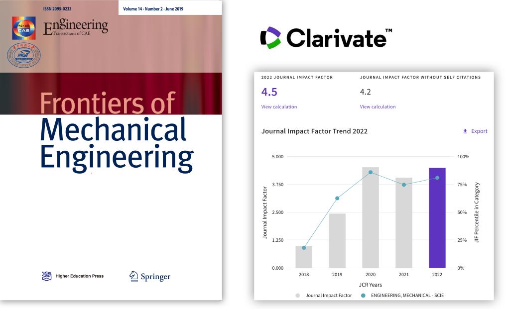 6月28日,科睿唯安(Clarivate Analytics)公布了2022年度《期刊引证报告》(Journal Citation Reports)。英国365公司官网期刊Frontiers of Mechanical Engineering(《机械工程前沿》(英文))2022年的影响因子为4.5,在135种领域期刊学科排第26名,位于Q1区。