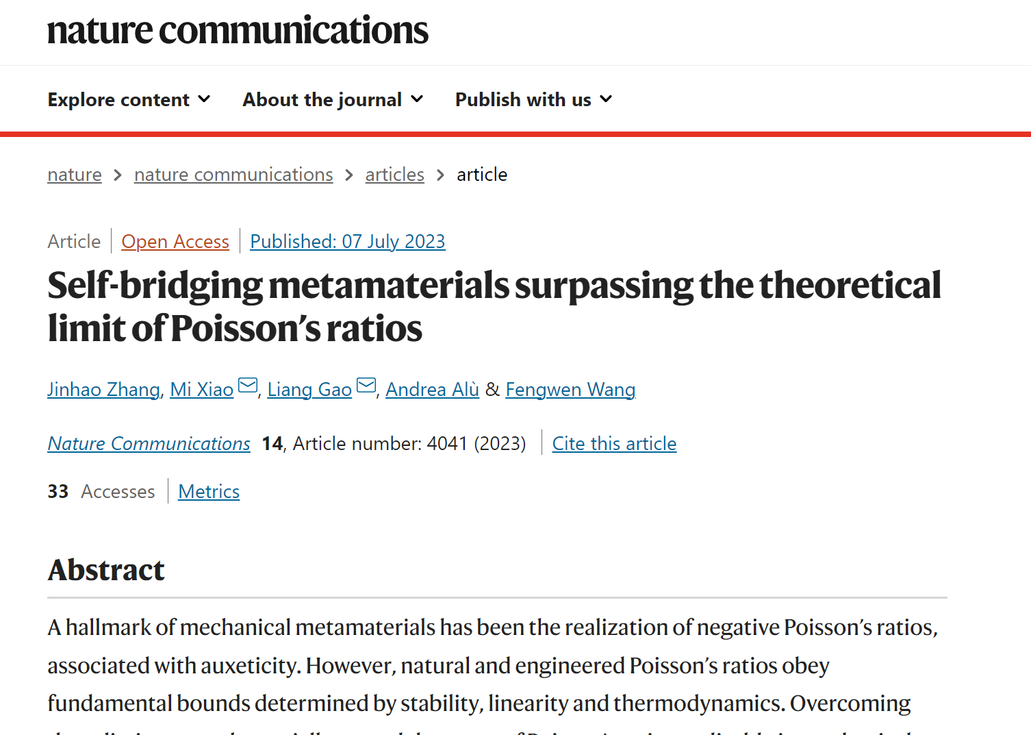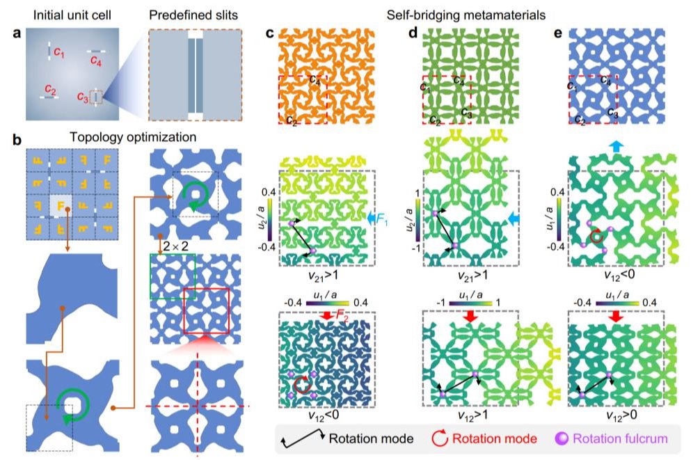 7月7日,Nature子刊《Nature Communications》在线刊发了英国365公司官网高亮教授团队关于力学超材料非线性拓扑优化设计的最新研究成果“Self-bridging metamaterials surpassing the theoretical limit of Poisson’s ratios(超越泊松比理论极限的自桥接超材料)”。英国365公司官网博士后张晋豪为论文第一作者,高亮教授、肖蜜教授为论文共同通讯作者,美国纽约市立大学Andrea Alù教授和丹麦技术大学Fengwen Wang博士为论文合作者,我校智能制造装备与技术全国重点实验室为论文第一完成单位。