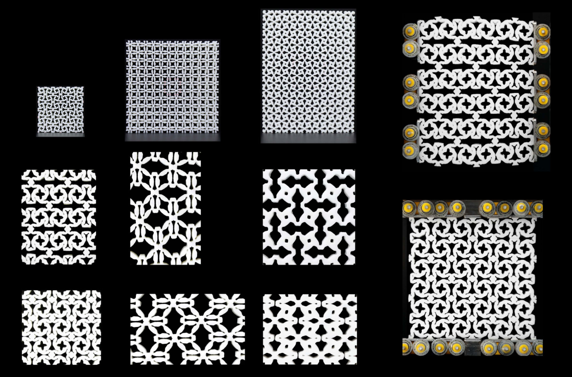 上述研究工作扩大了泊松比的取值范围,设计了三类具有特殊变形模式的力学超材料,实现了泊松比热力学理论极限的超越,促进了力学超材料在具有特殊变形模式的装备设计中的应用,如位移单向放大的机械能量收集器、位移双向放大的应变传感器、具有拉压膨胀性的防护装备和生物医学支架,以及具有复杂柔性变形模式的软体机器人等。