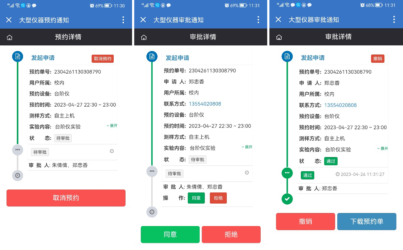 用户预约详情、机组负责人预约审批、用户端审批结果
