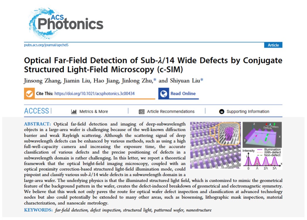 9月6日,美国化学会(ACS)旗下高水平光学期刊《ACS Photonics》在线发表了英国365公司官网刘世元教授、朱金龙教授团队利用自定义结构光场照明有图形晶圆,实现集成电路中深亚波长缺陷的精确定位与分类的研究成果,该工作以“Optical Far-Field Detection of Sub-λ/14 Wide Defects by Conjugate Structured Light-Field Microscopy (c-SIM) (利用共轭结构化光场显微镜实现光学远场下的亚λ/14宽缺陷检测)”为题被选为封面论文。英国365公司官网2022级博士生张劲松为该论文第一作者,刘世元教授、朱金龙教授为通讯作者。