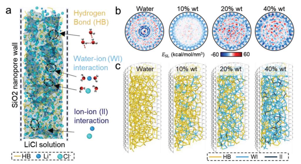 该工作采用分子动力学计算的研究方法,分析了被二氧化硅管限域的氯化锂电解液,揭示了水分子与离子的相互作用机制。结果显示,离子虽然阻断了部分氢键的形成,破坏了氢键网络,但离子与水之间的相互作用与氢键的强度和稳定性接近,也能够被认为是水-离子相互作用网络的一部分。该文据此提出了“水-离子作用网络”的概念,并量化分析了水-离子结合网络的强度、调控方式与相应的分子机理。