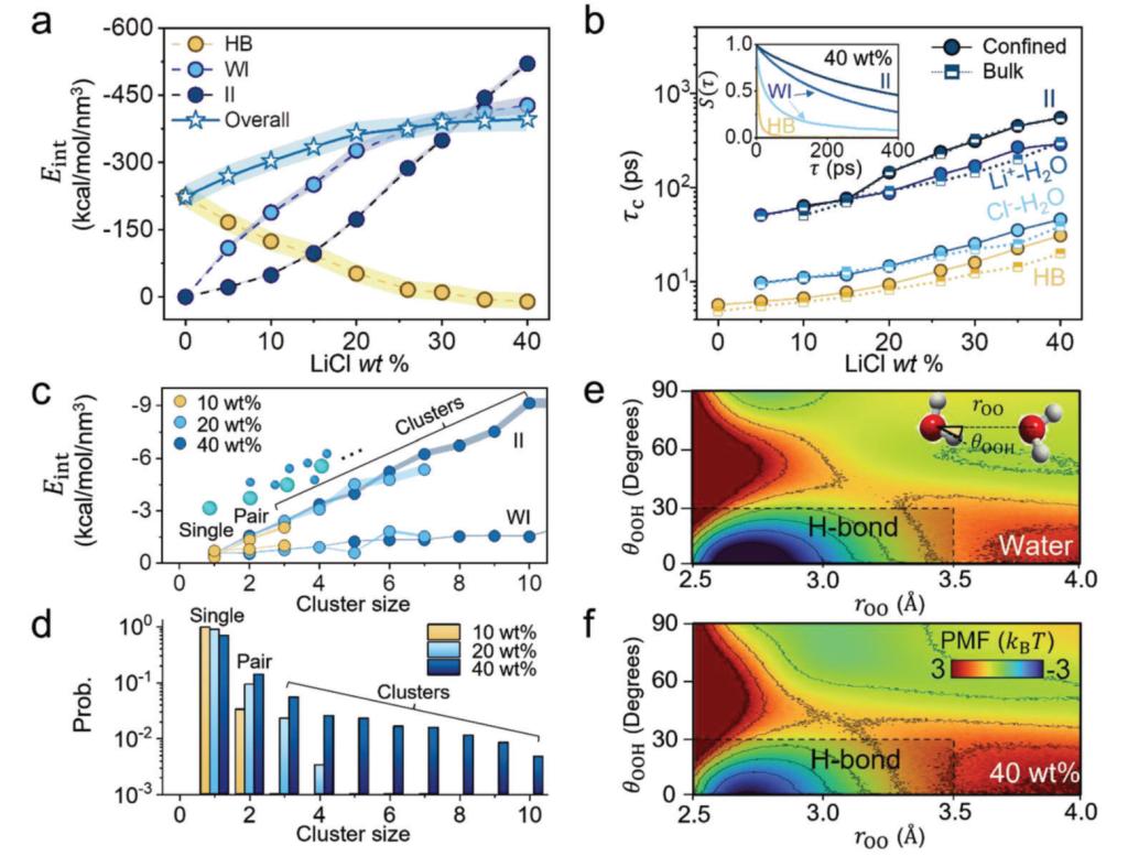 更进一步的计算研究表明,当溶质浓度更大时,作用网络更多由离子-离子作用、离子-水作用构成。上述作用在替代了原有的水-水(氢键)作用的同时,获得了更高的网络密度,说明离子-水、离子-离子、水-水三种相互作用具有不同的强度和稳定性。因此,本工作进一步对三种相互作用进行了动力学分析,发现离子-离子相互作用的能量最强,生命时长最长,离子-水作用次之,而原本的氢键相互作用最弱且生命时长最短。以上发现很好地解释了体系内聚能随着溶质浓度上升而增强的趋势。更高的溶质浓度可以促进团簇的形成,并且增强原有氢键网络的稳定性。综合考虑以上计算结果,水-离子作用网络能够增加被限域液体的内聚能。