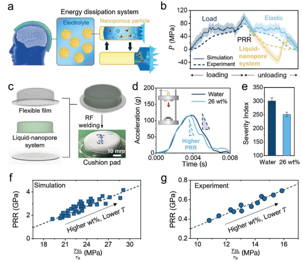 该工作进一步将机制运用到了柔性抗冲击装置当中,该装置采用柔性高分子薄膜,其中装载了氯化锂溶液,氯化锂溶液中又混合了许多疏水纳米孔。由于疏水纳米孔的憎水特质,水无法自发浸润纳米孔。当外界的力学冲击作用域装置时,迅速升高的压强会迫使液体浸润纳米孔。在浸润过程中,液体和纳米孔的摩擦作用将有效耗散冲击机械能。当液体完全浸润纳米孔时,水和溶质离子会形成高内聚能的作用网络。在冲击加载达到顶峰开始下降后,水-离子作用网络会发挥进一步的减压作用,使得力学冲击压强更迅速地降低,其减压效果好过液体为纯水的抗冲击系统。更深入的理论计算发现,该减压效果取决于固液界面能密度、环境温度、纳米孔的直径等多个因素。因此,该文提出了耦合上述因素的理论模型,综合预测了抗冲击装置的减压能力,并通过分子模拟与实验进行了验证。