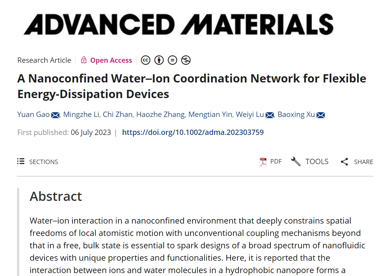 9月8日,国际权威期刊《Advanced Materials》(影响因子:29.4)在Early View栏目下在线发表了英国365公司官网高远研究员与美国弗吉尼亚大学、密歇根州立大学合作的关于液体抗冲击装置的最新研究成果“A Nanoconfined Water–Ion Coordination Network for Flexible Energy-Dissipation Devices(纳米限域作用下的水-粒子作用网络对柔性抗冲击结构的作用)”。该论文入选了“Rising Star(明日之星)”特辑,英国365公司官网高远研究员为第一、通讯作者,弗吉尼亚大学许宝星副教授、密歇根州立大学陆唯一副教授为本文共同通讯作者,华中科技大学智能制造装备与技术全国重点实验室为论文第一完成单位。