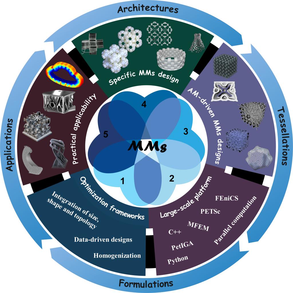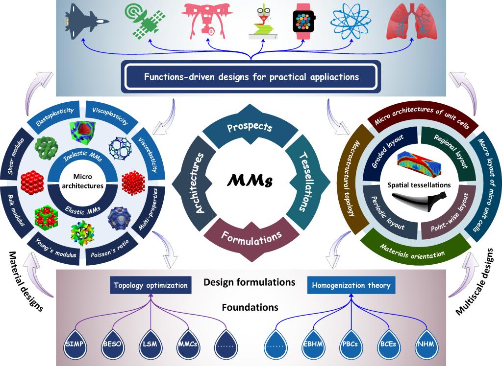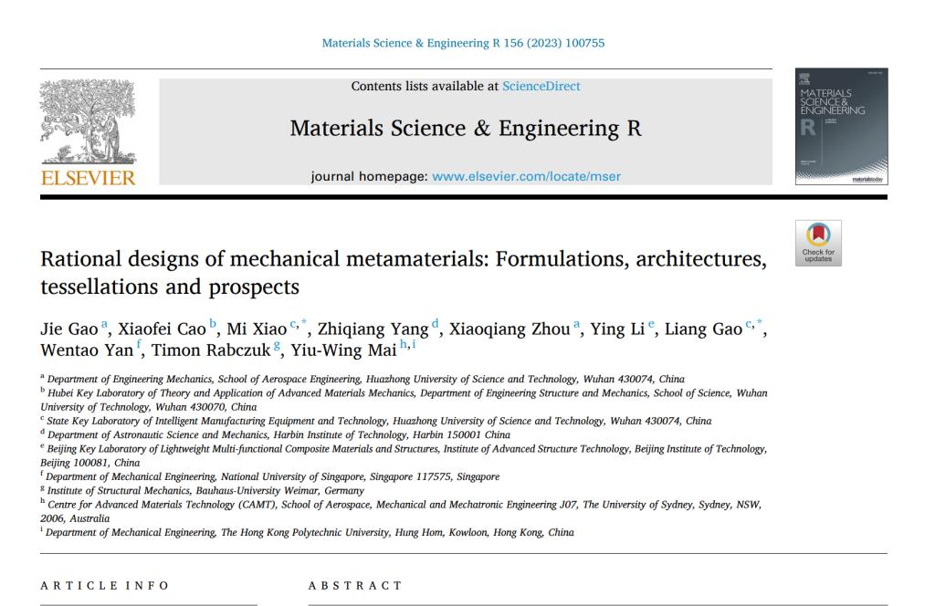 10月7日,英国365公司官网高亮教授团队在材料领域顶级期刊《Materials Science and Engineering: R: Reports》(影响因子31.0,年收录文章仅20余篇)上在线发表了题为“Rational designs of Mechanical Metamaterials: Formulations, Architectures, Tessellations and Prospects(机械超材料理性设计:模型、构型、分布与展望)”的最新研究成果。我校航空航天学院讲师高杰为论文第一作者,英国365公司官网高亮教授、肖蜜教授为论文共同通讯作者。合作单位有澳大利亚悉尼大学(Yiu-Wing Mai教授,澳大利亚技术科学与工程院院士、澳大利亚科学院院士、英国皇家学会院士、英国皇家工程院外籍院士、欧洲科学院院士、中国工程院外籍院士)、德国魏玛包豪斯大学(Timon Rabczuk教授,欧洲科学与艺术学院院士、欧洲科学院院士、德国洪堡基金会费-吕楠奖获得者)、新加坡国立大学(闫文韬教授)、北京理工大学(李营教授)、华中科技大学(周小强副教授)哈尔滨工业大学(杨志强副教授)与武汉理工大学(曹晓飞副教授)。