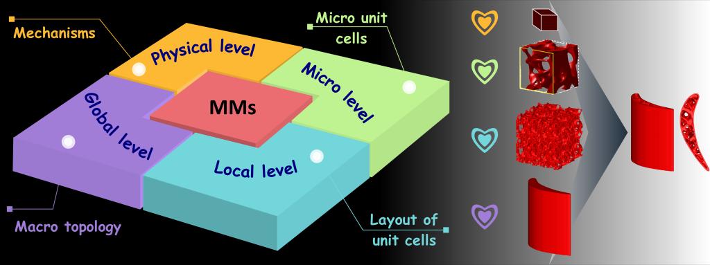 图2 机械超材料四类设计要素:本构模型、微尺度构型、局部分布与宏观拓扑