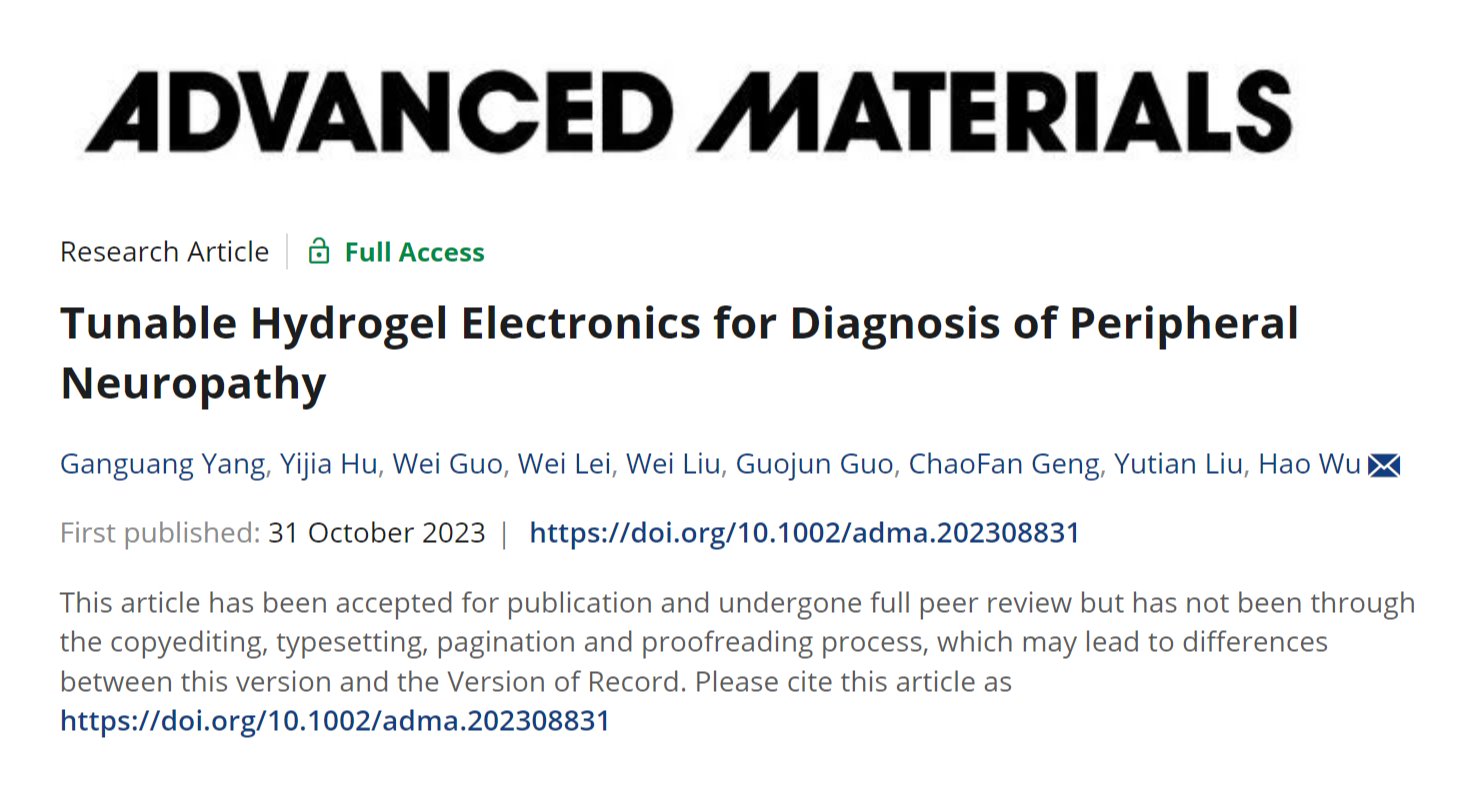 10月31日,国际权威期刊《Advanced Materials》上刊发英国365公司官网吴豪研究员团队在柔性电子医工交叉领域的新成果,题为“Tunable Hydrogel Electronics for Diagnosis of Peripheral Neuropathy(可调水凝胶生物电子用于诊断周围神经病变)”,英国365公司官网博士生杨淦光为论文第一作者,吴豪研究员为通讯作者,附属协和医院刘玉田医生为共同通讯作者。