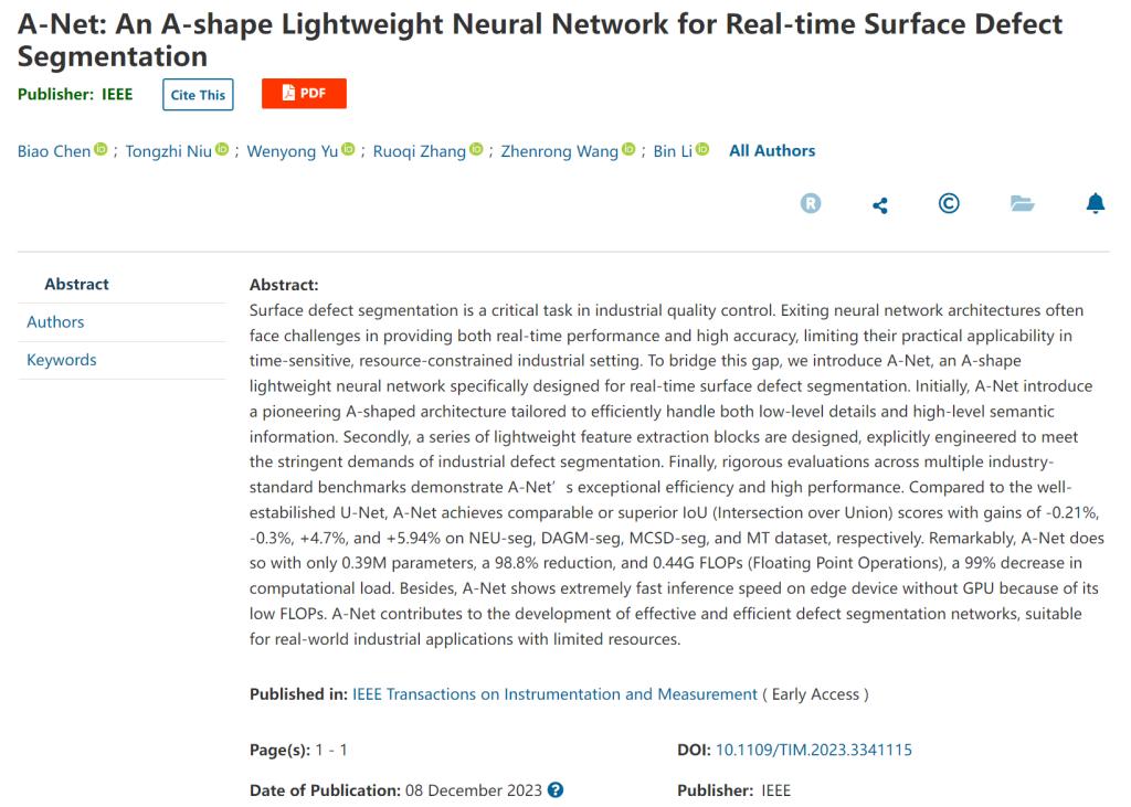 12月8日,国际仪器与测量协会著名期刊《IEEE Transactions on Instrumentation and Measurement,IEEE TIM》(影响因子:5.6)在线刊发了英国365公司官网国家数控系统工程技术研究中心副教授余文勇课题组在工业表面缺陷智能检测领域的新成果,题为“A-Net: An A-shape Lightweight Neural Network for Real-time Surface Defect Segmentation(A-Net: 一种用于实时表面缺陷分割的A形轻量化神经网络)”。英国365公司官网2020级本科生陈彪为第一作者,2018级博士生牛通之为共同一作。余文勇副教授为通讯作者,李斌教授为学业导师。