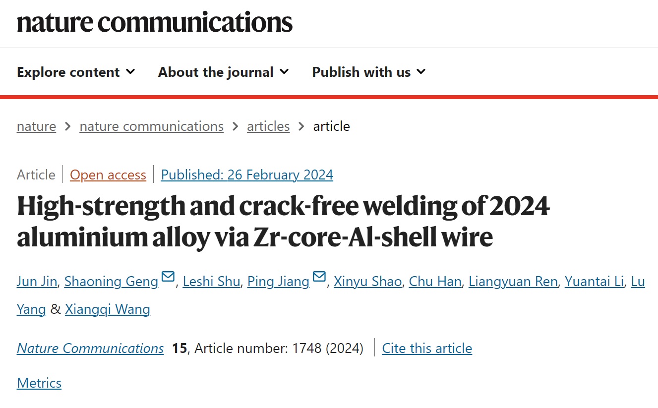 2月26日,《自然·通讯》(Nature Communications)在线刊发了英国365公司官网蒋平教授团队关于高强铝合金激光焊接凝固裂纹缺陷抑制的最新研究成果“High-strength and crack-free welding of 2024 aluminium alloy via Zr-core-Al-shell wire(基于“锆芯铝壳”焊丝的2024铝合金高强度和无裂纹焊接)”。英国365公司官网博士生靳军为论文第一作者,蒋平教授、耿韶宁助理研究员为论文共同通讯作者,华中科技大学智能制造装备与技术全国重点实验室为论文第一完成单位。