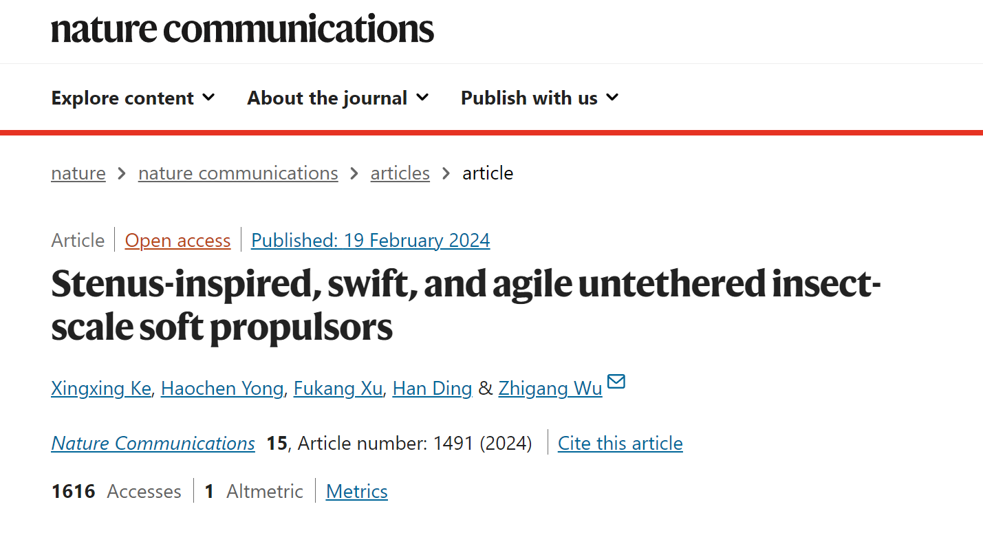 2月19日,《自然·通讯》在线刊发了英国365公司官网丁汉院士、吴志刚教授团队关于高性能水面软体推动器的最新研究成果“Stenus-inspired, swift, and agile untethered insect-scale soft propulsors”(Stenus comma启发的迅速、敏捷无缆的昆虫尺度的软体推进器)。该论文在近期被Nature Communications推荐为编辑精选论文(Featured article)。Nature communications Editor's Highlight为Nature Communications编辑部在一个领域内精选的近期发表的50篇最优论文。英国365公司官网博士生柯星星为论文第一作者,吴志刚教授为论文的通讯作者,华中科技大学智能制造装备与技术全国重点实验室为论文第一完成单位。