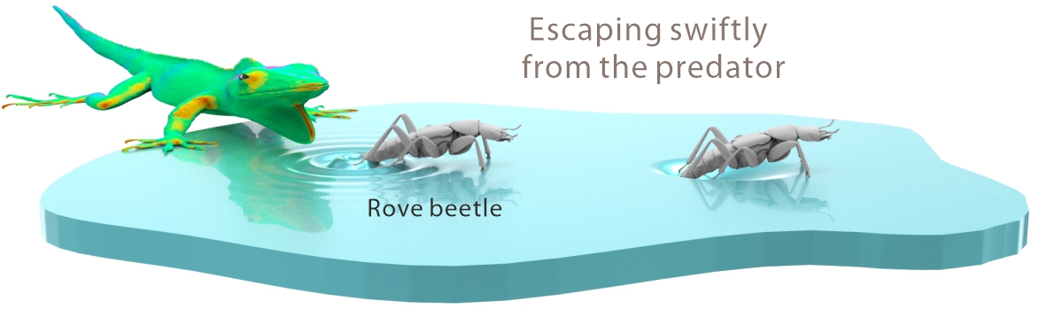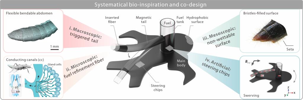 研究团队通过系统地解析隐翅虫的跨尺度结构来理解这一现象:i. 在宏观尺度上,隐翅虫拥有柔顺灵巧的腹部结构,可用于按需控制活性剂(动力物质);ii. 在介观尺度上,其非浸润刚毛结构保证了在水面上的稳定运动;iii. 在微观尺度上,大量的导管结构用于液体成分的内部运输。这些跨尺度的结构有助于实现隐翅虫高速、按需的快速驱动行为,如图2。