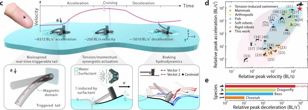 研究团队通过引入软体可实时磁驱尾巴、超疏水表面、尾部各项异性的纤维束等结构,并协同的引入了一对额外的解耦的磁驱“定向芯片”。通过跨尺度系统级仿生和人造结构增强构建了一个昆虫尺度水面推进器(Uni-SoPro),如图3所示。它可以实现在单一3D的可编程磁场(三维赫姆霍兹线圈)驱动下,按需实现极高的加速度(8372 BL/s2)、速度(201 BL/s)和减加速度(-5010 BL/s2)的推进和制动行为。该Uni-SoPro昆虫尺度水面推进器实现了类似的隐翅虫紧急情况下高速逃逸行为。