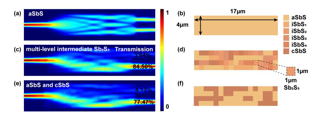 如下图所示为可编程的多模干涉耦合器,硫化锑矩阵初始状态为非晶态,如图(a)(b)所示。使用多值优化算法改变硫化锑像素的状态保证下波导中输出最大。通过对比具有多级中间态的多模干涉耦合器(图(c)与(d))与只有非晶态和晶态的多模干涉耦合器(图(e)与(f)),可以看出多级相变材料具有更优越的性能。