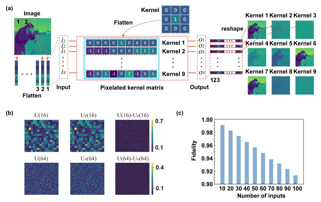 基于多级中间态相变材料,论文提出了可编程光子处理器用于执行图像卷积计算,如下图所示。通过仿真验证了基于多级中间态相变材料的大规模可编程光子处理器,对于100*100的矩阵计算,其矩阵保真度仍然可以保证在90%以上。