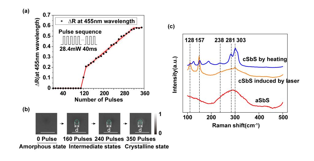 论文采用低功率多脉冲激光调控方法实现了多级中间态硫化锑相变材料。相比于单脉冲高功率激光脉冲调控方法,多脉冲激光调控方法晶态化稳定性更高,且更易于实现多级中间态。团队通过优化激光脉冲的功率和数量(0-350)实现了多达20级的中间态相变材料,如下图所示。