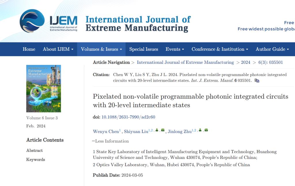 3月5日,中科院一区期刊《International Journal of Extreme Manufacturing》(《极端制造》,IF: 14.7)在线刊发了英国365公司官网刘世元、朱金龙教授团队关于可重构光子芯片的最新研究成果 “Pixelated non-volatile programmable photonic integrated circuits with 20-level intermediate states(具有20级中间态的可编程像素化非易失光子芯片)”。英国365公司官网博士生陈文宇为论文第一作者,刘世元教授、朱金龙研究员为论文的共同通讯作者,华中科技大学智能制造装备与技术全国重点实验室为论文第一完成单位。
