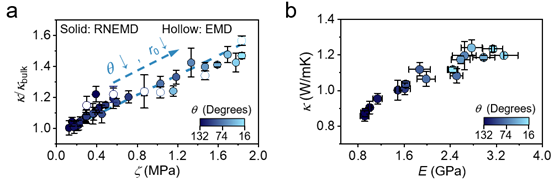 针对限域水的热性质计算研究表明,限域水的热导随着限域尺度的减小和固液相互作用的增强而增加,此时的限域效应最强。相反,如果限域尺度无限大,或者固液间相互作用不存在,限域效应消失,水的热导值将回归宏观状态下的性质。以上发现可以通过限域理论建立标度率,实现量化预测。并且,纳米限域水与固体类似,本征热导率与其等效的杨氏模量呈正相关。