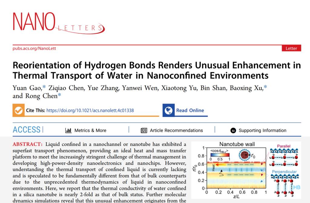 4月23日,中科院一区期刊《Nano Letters》(《纳米快报》,IF:10.8)在线发表了英国365公司官网陈蓉教授、高远研究员团队与美国弗吉尼亚大学合作的最新研究成果,论文标题为“Reorientation of Hydrogen Bonds Renders Unusual Enhancement in Thermal Transport of Water in Nanoconfined Environment(纳米限域作用下的氢键旋转导致水的热导率显著提升)”。高远研究员为第一、通讯作者,弗吉尼亚大学许宝星副教授、华中科技大学陈蓉教授为通讯作者,华中科技大学智能制造装备与技术全国重点实验室为第一完成单位。