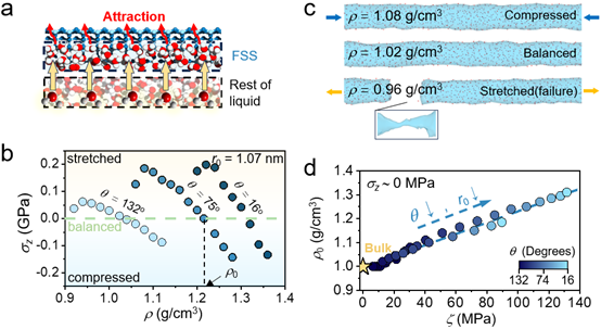 研究团队采用分子动力学计算的研究方法,首先揭示了在先前研究中被忽略的限域应力及其特性,该应力能够对限域流体的热力学效应产生显著影响,与先前研究中颇具争议的结果密切相关。由于纳流道孔壁对水分子的吸引作用,限域水的分子间结构相对于宏观块体水发生了显著改变,从而引发了限域应力。当该应力较大时,限域水会呈现像固体一样的颈缩效应,随即被拉断。限域应力同样会对限域水的热性质产生较大影响,而先前研究往往忽略该应力的存在,从而导致结果具有争议。为规避限域应力的影响,研究团队建立了基于限域尺度和固液相互作用强度的理论模型,并准确预测了限域水平衡状态下(限域应力)的密度与结构。
